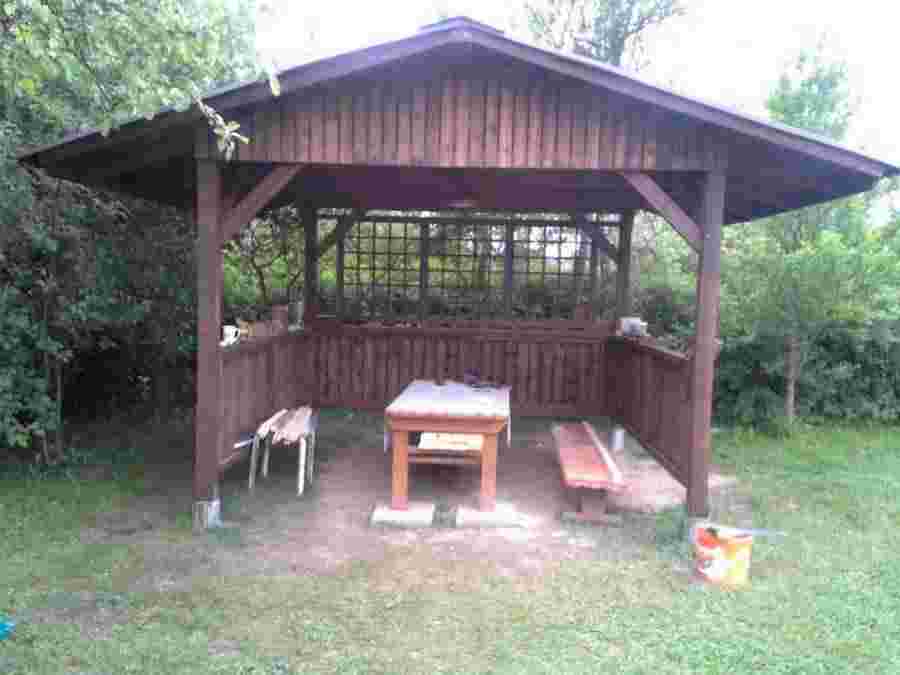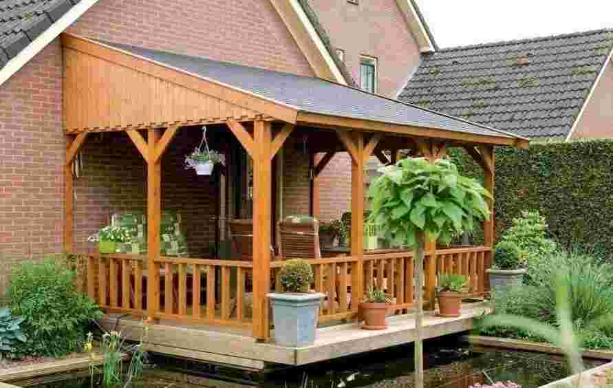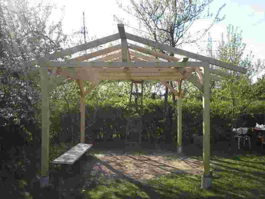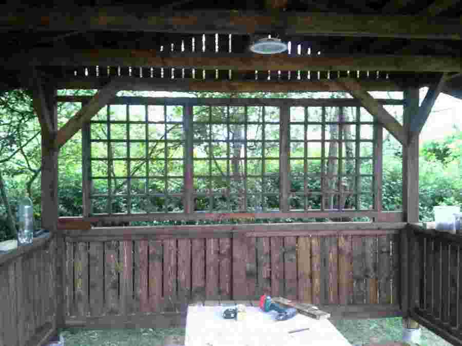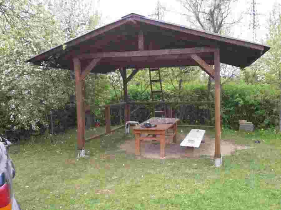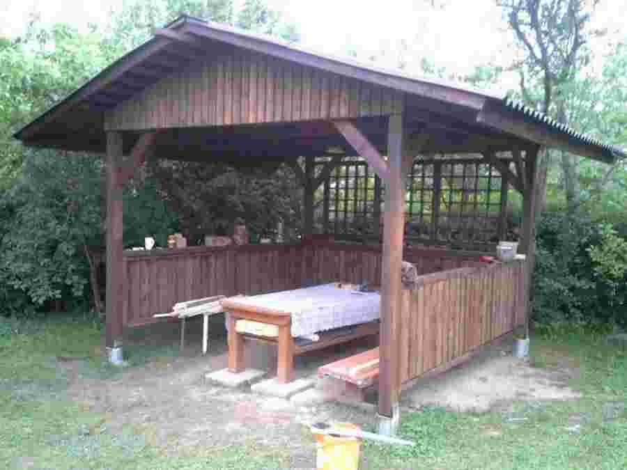 Немецком. Беседка представляет собой каркасную конструкцию прямоугольной формы. Крыша может быть двускатной или четырехскатной. Главной особенностью является заполнение, которое выполняется в стиле фахверк;