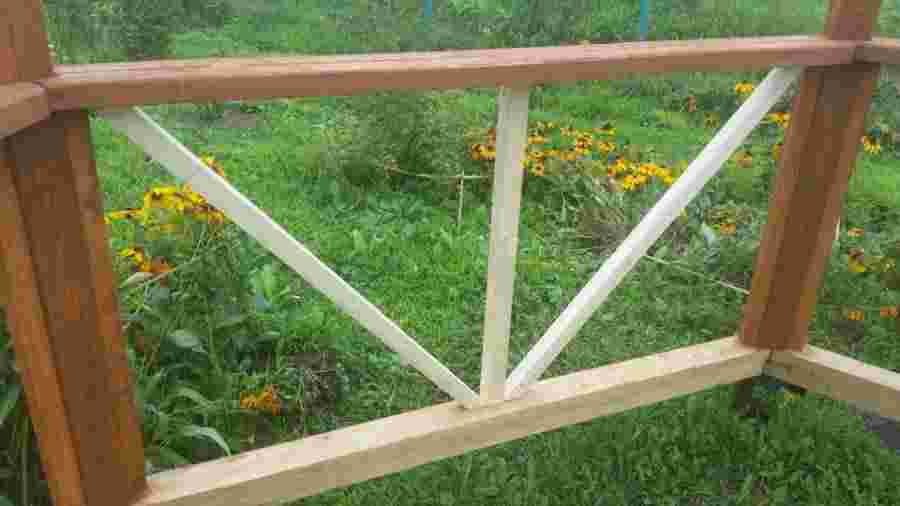 Средняя обвязка должна быть на высоте около одного метра. Для этого используется труба с сечением 40Х20 мм. Для придания жесткости, рекомендуется закрепить вертикальные стойки, как показано на изображении ниже