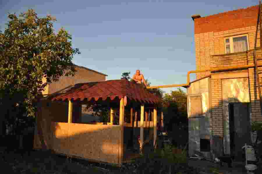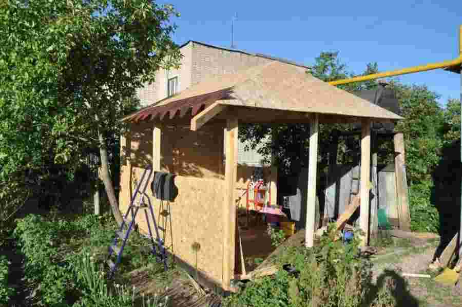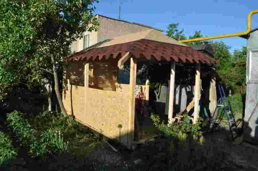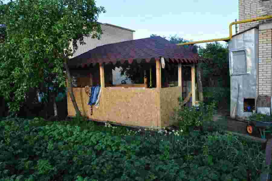 Украинском. Такая беседка имеет каркасную конструкцию. Главной ее особенностью является соломенная крыша под старину. Кроме того, в качестве заполнения используется плетень из ивовой лозы или необработанные бревна;