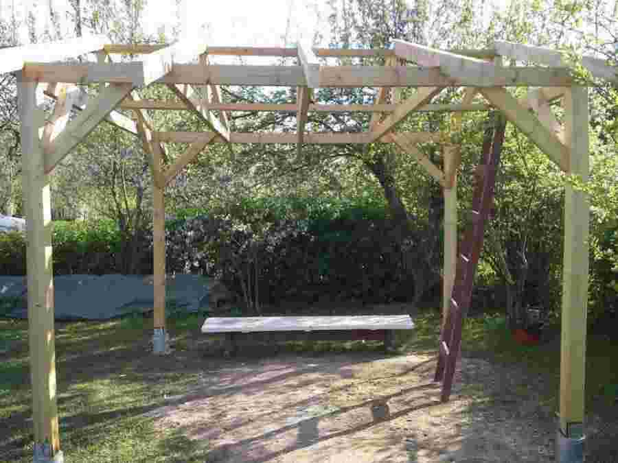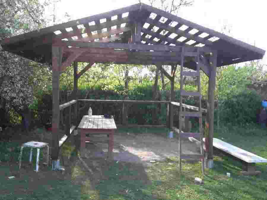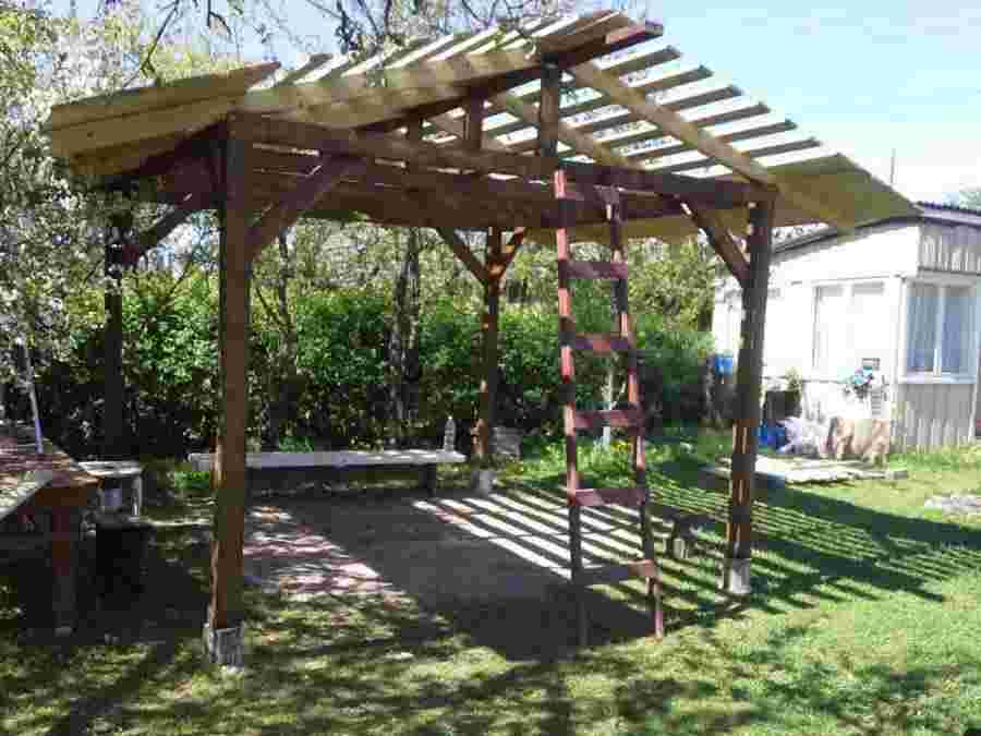 Еще один вариант, как сделать прямоугольную беседку своими руками. Если есть финансовые возможности, то конечно лучше купить качественную древесину, типа кедр, сосна или красное дерево. Также убедитесь, что используемый материал соответствует климатическим условиям. По данному проекту, при наличии всем материалов беседку можно построить за один день.