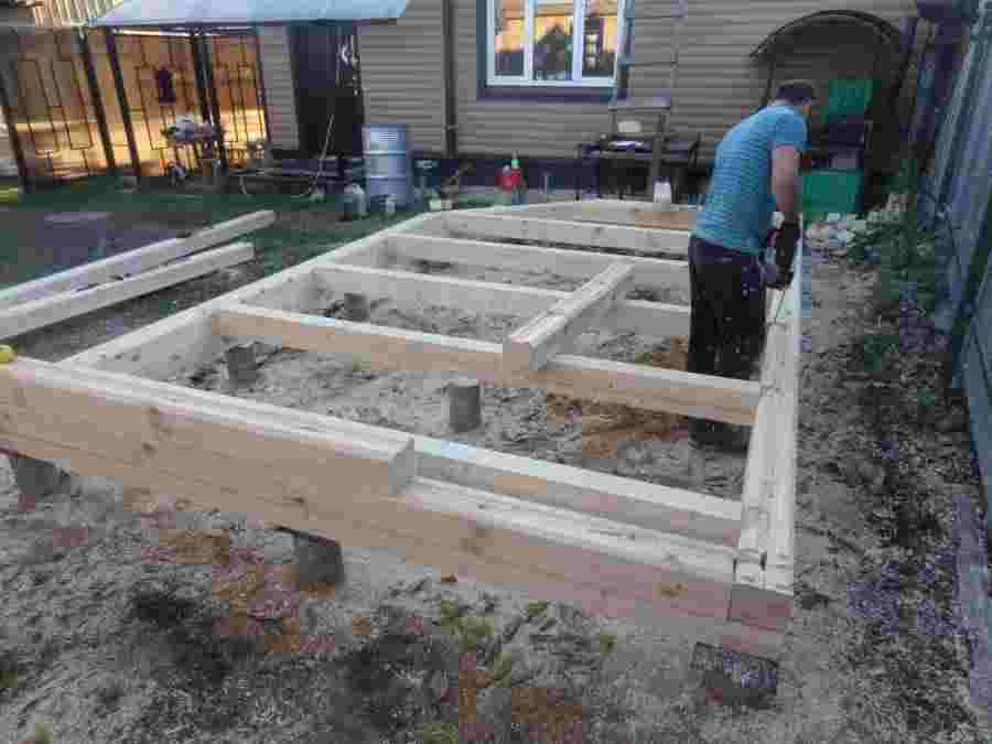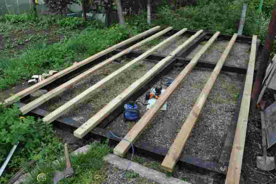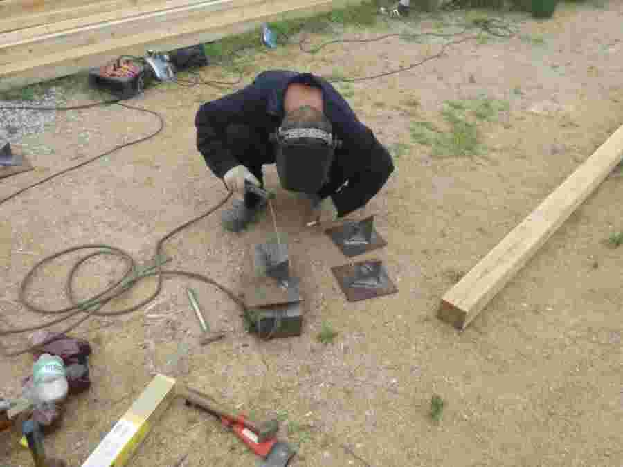 На следующем этапе делается нижняя обвязка, для этого трубы с сечением 50Х50 мм укладываются на бетонные блоки. Угли свариваются аппаратом. Для перемычек подойдет профиль с сечением 40Х20 мм, на них будут укладываться доски.
