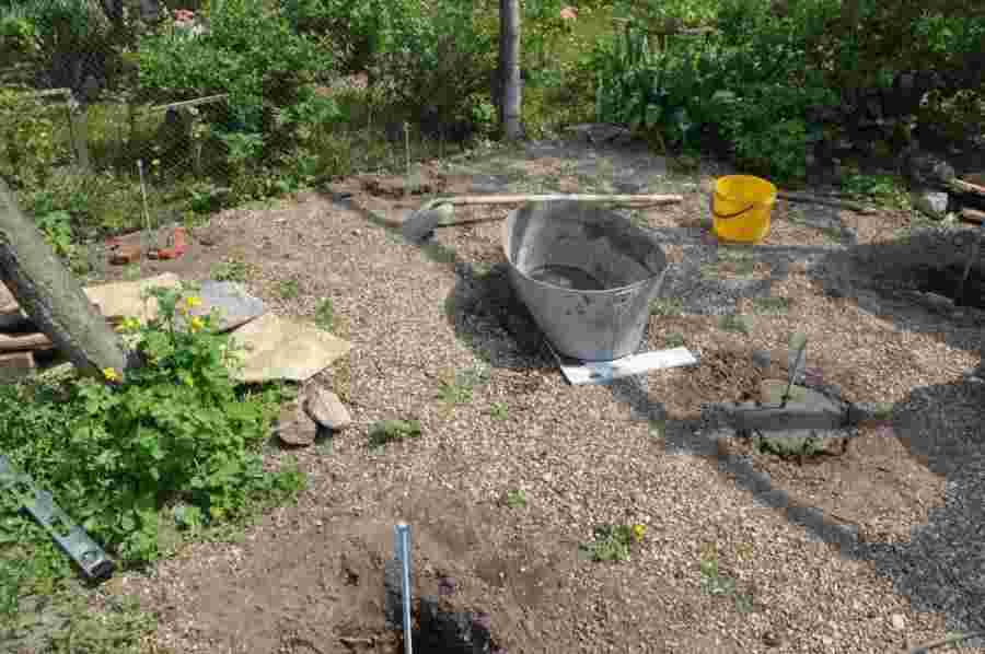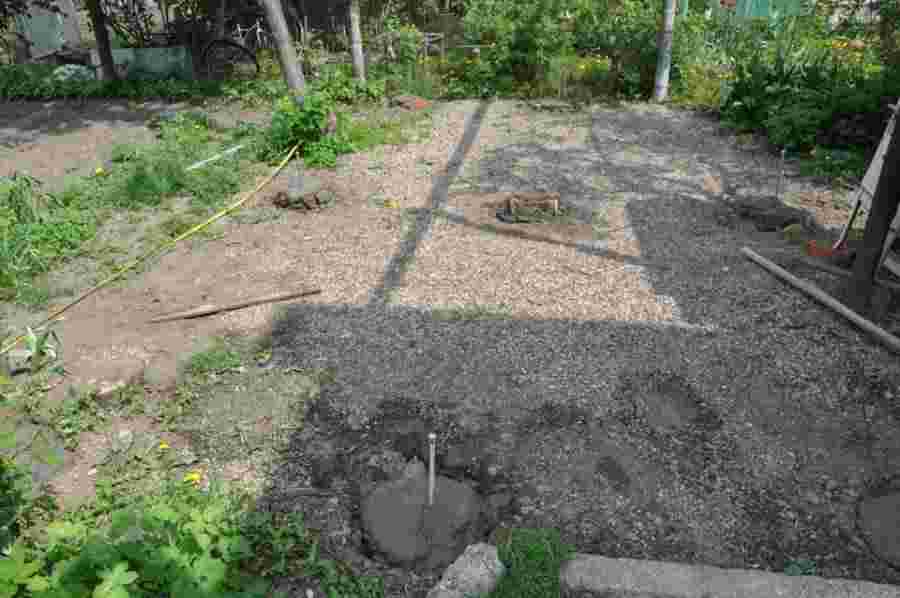 При помощи бура сделать неглубокие ямы, около 90 см. В них вставляются трубы и засыпаются щебнем или строительным мусором, после чего тщательно все трамбуется. Стойку нужно залить цементным раствором.