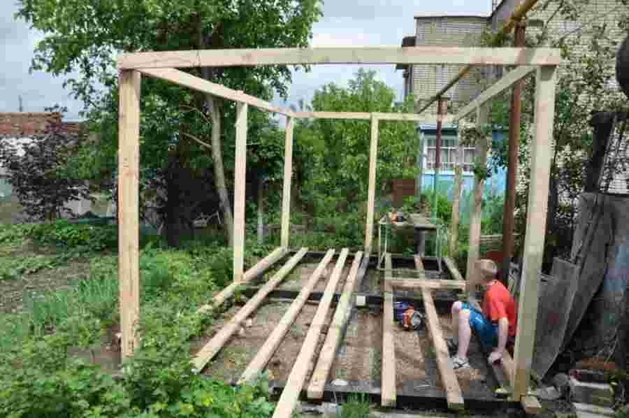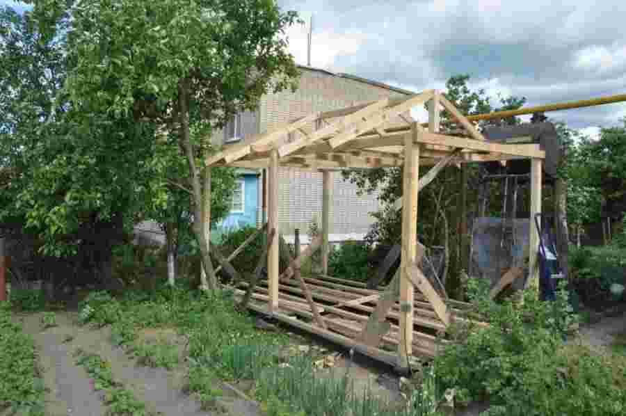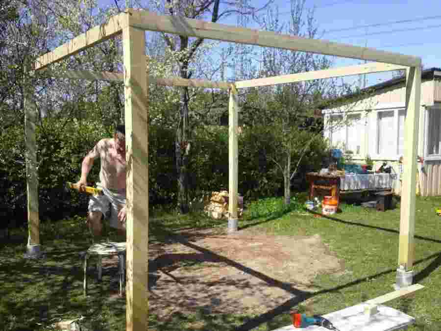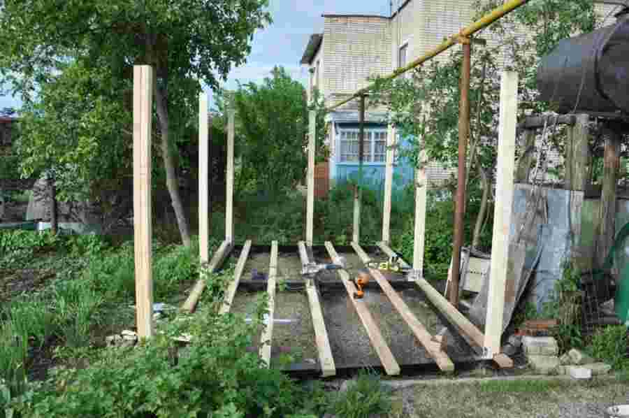 После того, как будет выбрано место под будущую конструкцию, и подготовлено надежное основание, нужно приступить к монтажу каркаса. В качестве стоек рекомендуется воспользоваться брусом, с сечением 60Х60 мм, которые крепятся проволокой, а затем уголками на саморезы.