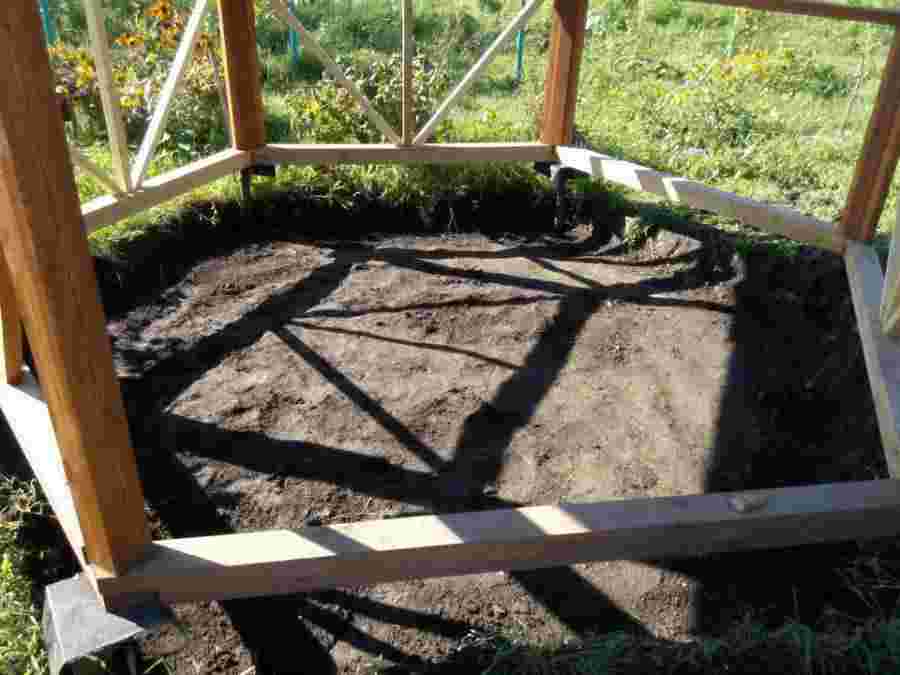 Этот вид фундамента отлично подойдет для маленькой беседки круглой или квадратной формы. Размечают границы участка, после чего выбирают грунт на глубину 40-50 см. Выравнивают и утрамбовывают дно котлована, засыпают его песком на высоту 10-15 см, проливают водой и снова трамбуют. Затем насыпают щебень слоем 15 см и укладывают армирующую сетку из прутьев, связанных проволокой.
