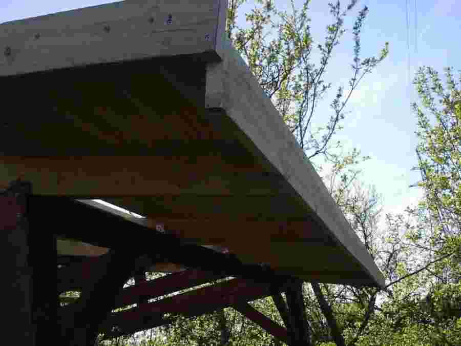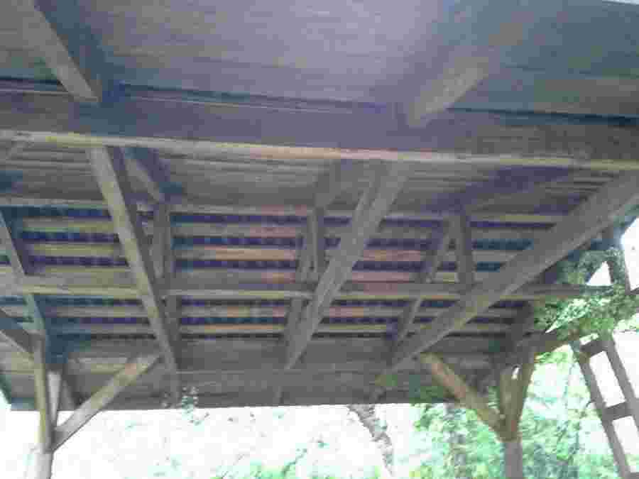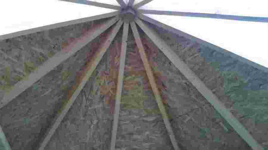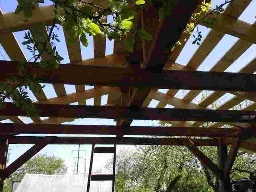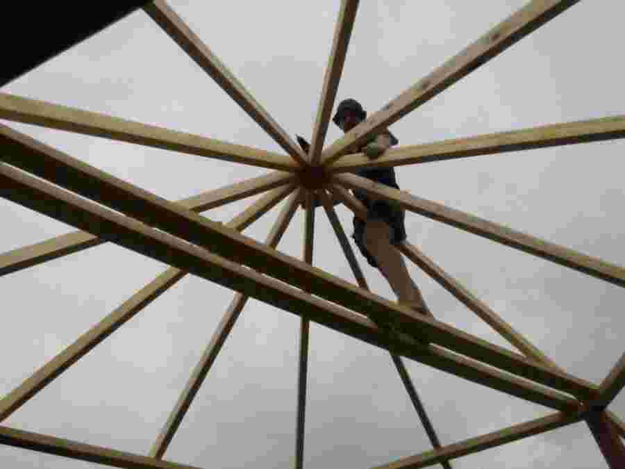 Первый этап это изготовление и установка верхнего гребня и стропил. Как видите на картинке, необходимо отрезать концы стропил нужного размера и закрепить на верхние перекладины шурупами. Убедитесь, что верхний гребень расположен горизонтально, иначе крыша не будет симметричной. Следующий этап установка стропил с обеих сторон крыши. Вы должны поместить балки по центру. Обрежьте стропила до необходимого размера ( 45 °) и формы и установите их на место. Просверлите отверстия и закрепить их оцинкованными винтами. Прикрепите стропила к передним и задним граням прямоугольной беседки. Установите боковые стропила. Закрепите кровельные листы. Для того, чтобы защитить беседку от осадков, рекомендуется покрыть кровельные листы толем