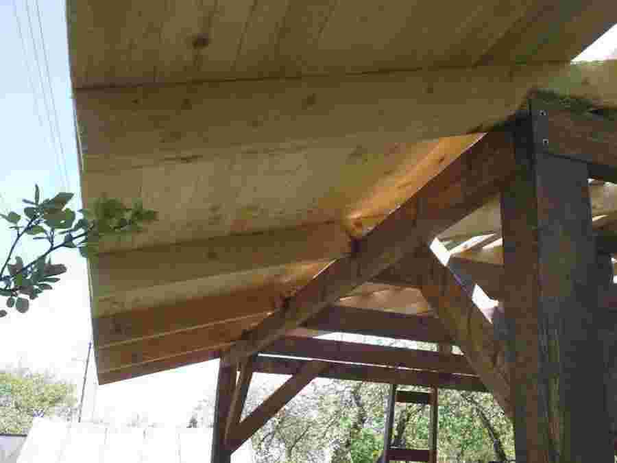 Если в качестве кровли будет использоваться битумная черепица, то стропилы крыши нужно делать из деревянного бруска, с сечением 75Х40 мм. Обрешетку можно сделать из деревянной вагонки. В верхней части стропилы крепятся при помощи саморезов.