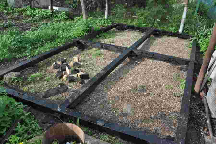 Важно! Для выравнивания участка рекомендуется удалить верхний дерновой слой почвы толщиной 10–15 см. Основными материалами являются брус 150×150 мм, доски 50×150 мм и битумная черепица