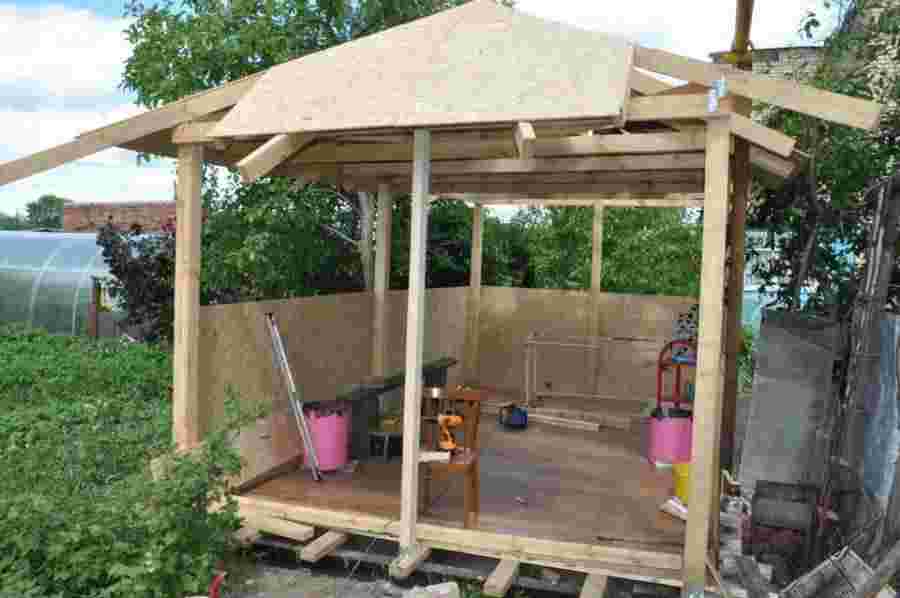 В качестве примера рассмотрим как изготавливается классическая четырехгранная каркасная беседка с двускатной крышей.