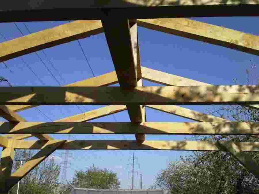 Для стропил можно использовать брусья с сечением 60Х40 мм. В первую очередь крепятся боковые стропильные ноги, в центре балка, после чего наклонные брусья. В результате чего должно получиться пять брусьев.