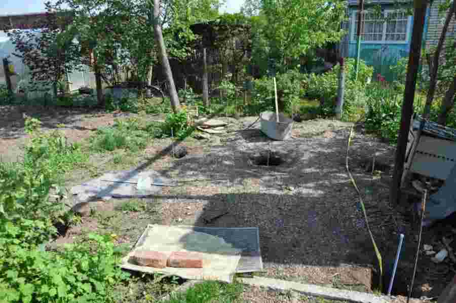 Выбранную площадку нужно очистить от мусора и травы, чтобы она не гнила под полом. Затем вырыть яму, засыпать ее слоем песка. Трубы можно устанавливать непосредственно в грунт.