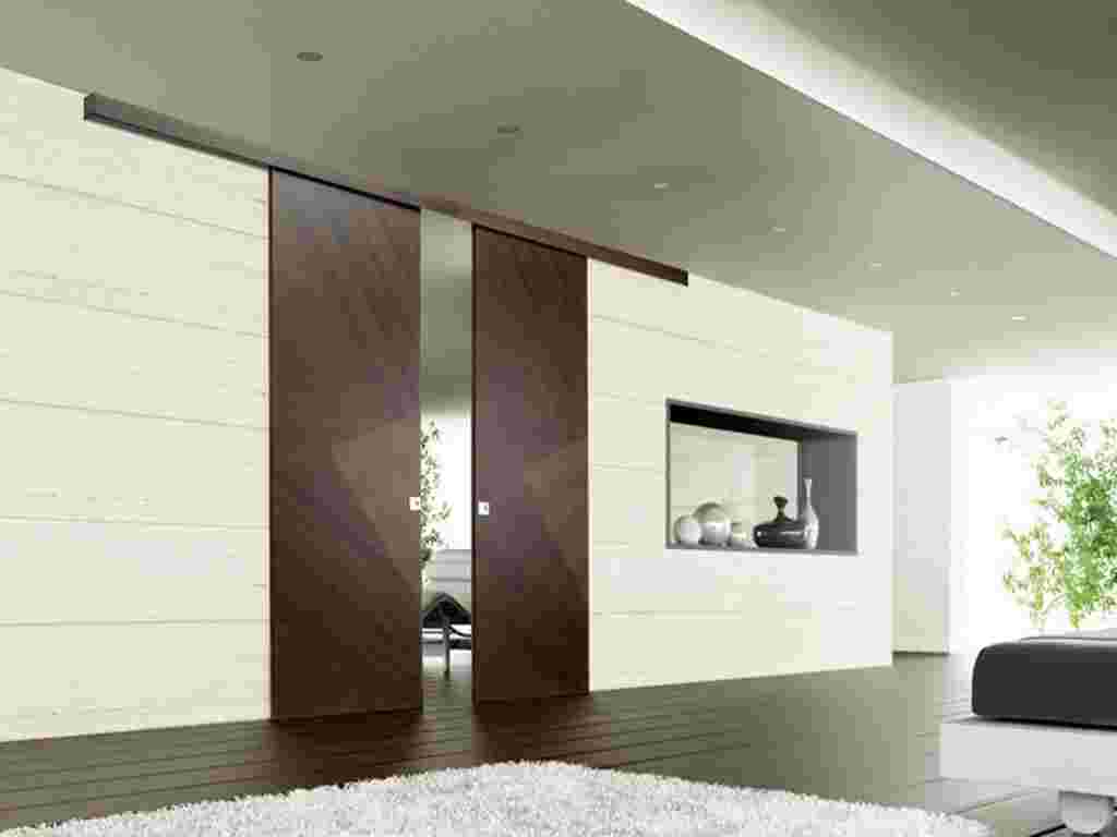 Раздвижные двери в интерьере удобны и практичны. Выбрать их можно для квартира небольшой площади. Поставить полотно нужно по направляющим относительно стены, а движение их обеспечивается за счет перемещения на роликах. Устанавливать раздвижную конструкцию рекомендуется для разделения одного помещения на отдельные участки.