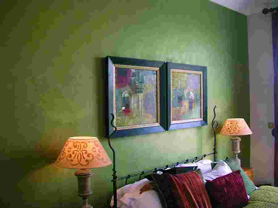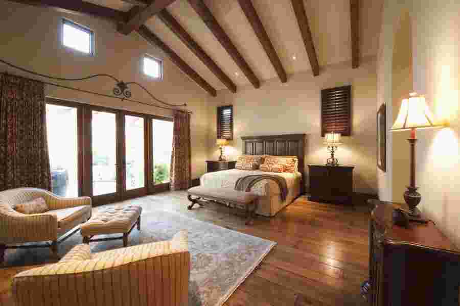 Окрашенные в оливковый цвет балки, вагонка на стенах спальни в стиле провансИсточник bucwar.ru