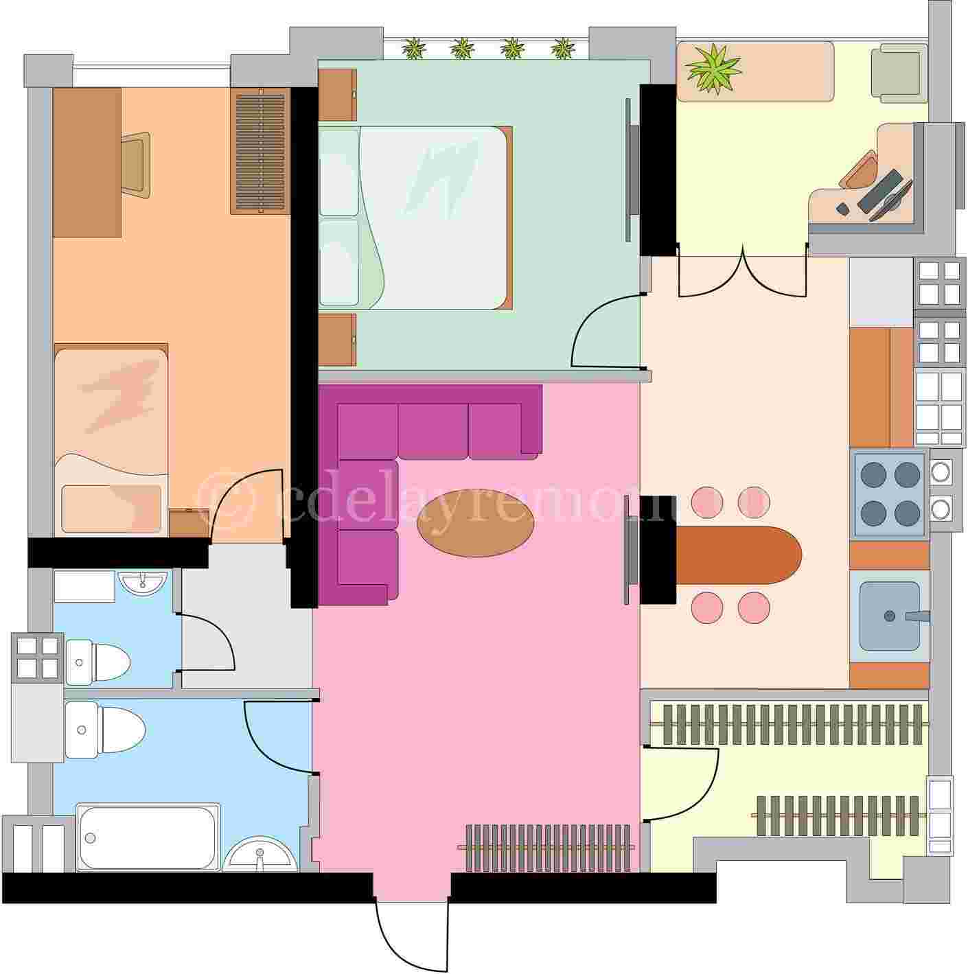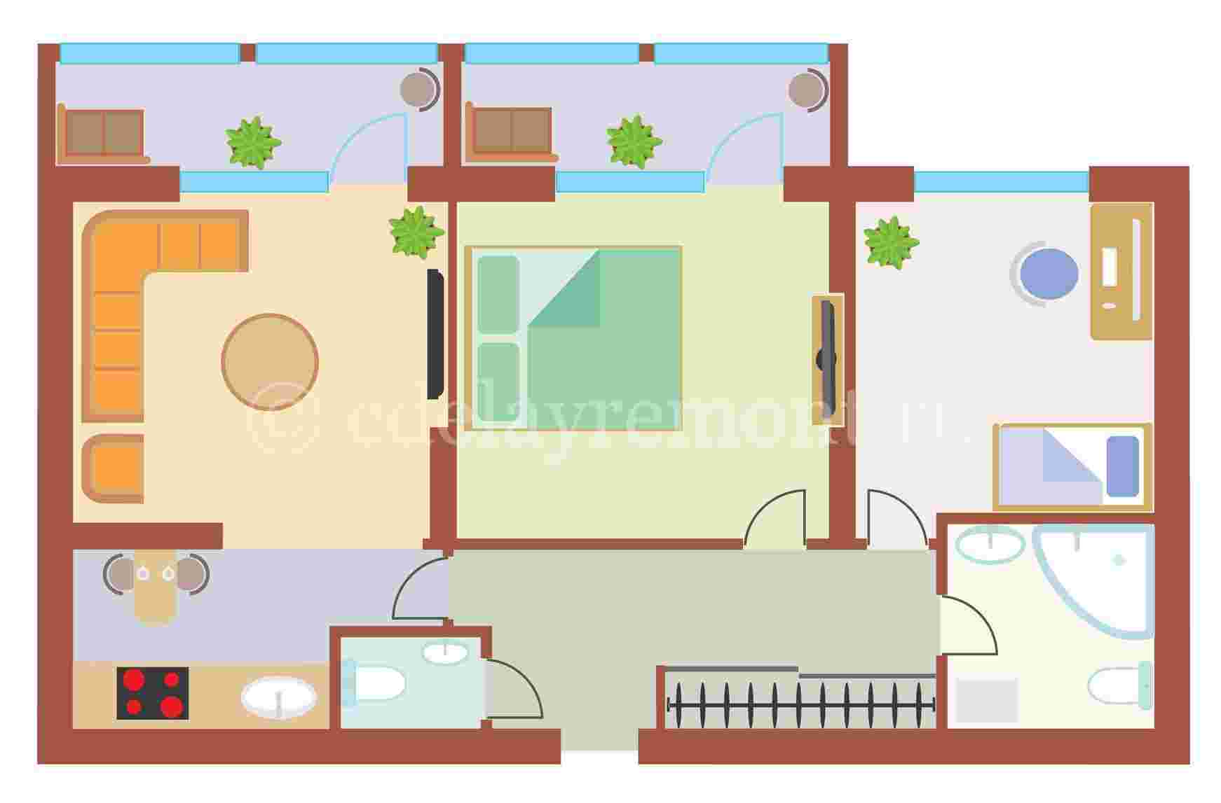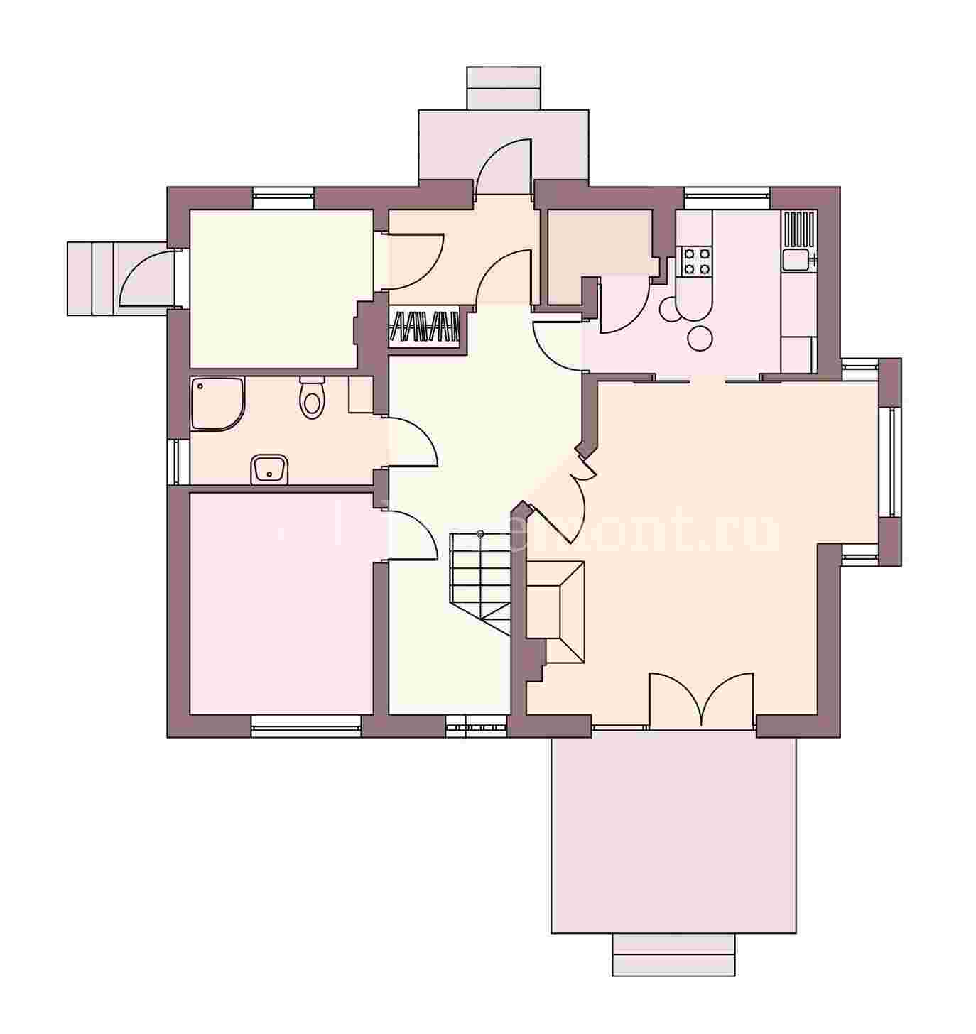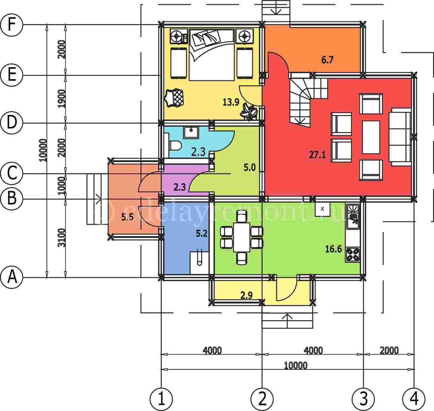 Полезная площадь такого дома составляет чуть больше 70 кв. м. Но это не мешает превратить его в удобное и функциональное жилье для отдыха в теплую пору года. Дом может иметь небольшой эркер, веранду или террасу, которые придают ему оригинальный внешний вид и увеличивают полезную площадь. Отличительной особенностью планировки является наличие нескольких отдельных входов. Имеется три непроходных помещения, разделенные коридором, один санузел, небольшая кухня. Предполагается наличие небольшой мансарды, которую можно использовать в качестве гостевого помещения. Средняя стоимость такого коттеджа не превышает 1 млн. руб.