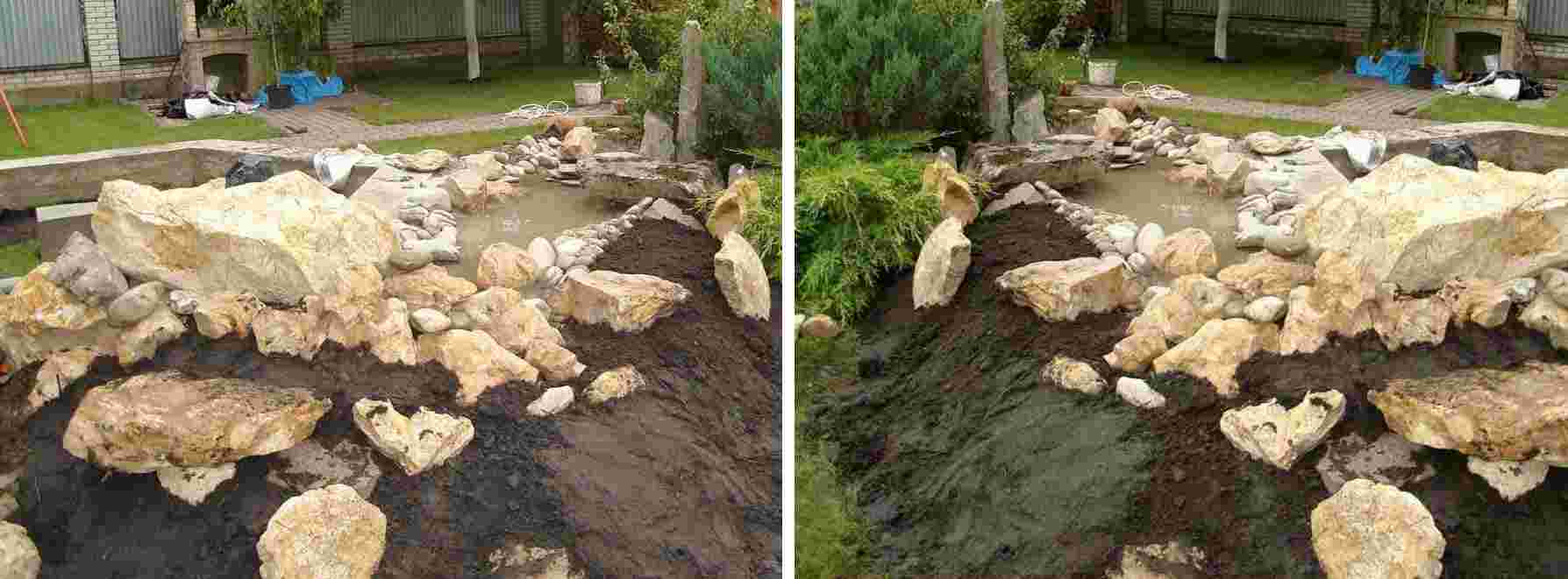 - Вторым рядом будут служить более мелкие камни. Делать можно несколько ярусов, каждый из которых будет немного возвышаться над предыдущим — регулируется это высотой предварительно насыпаемой горки.