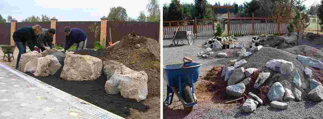 У подножия крупных валунов необходимо разместить камни среднего размера, но это не является догмой – иногда достаточно присыпать грунт вокруг щебнем мелкой или средней фракции.