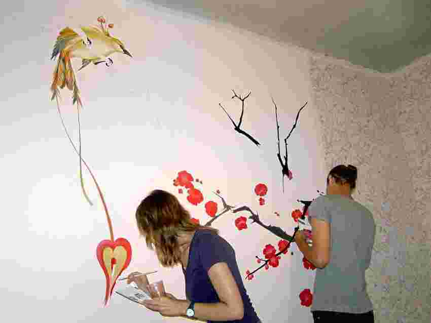 На покрашенной однотонной стене даже человек без выраженных художественных способностей может сделать роспись. Для этого существуют трафареты – просто прикладываешь шаблон к поверхности и закрашиваешь нужные места. А можно нарисовать акриловыми красками по заранее подготовленному эскизу, например, крылья (ангела, бабочки). И это будет обожаемая всеми фотозона в доме.