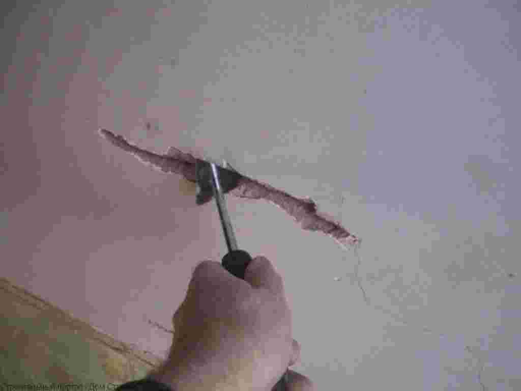 Сложность ремонта штукатурного основания состоит в толщине слоя (до 20 мм), невозможности определить без сложных лабораторных исследований марки и состава штукатурки. К тому же часто при малейшем ударе или расчистке щели, некачественный раствор с большим содержанием песка отваливается пластами. Но если не сбить плохо держащийся слой, то трещины будут возникать снова и снова.