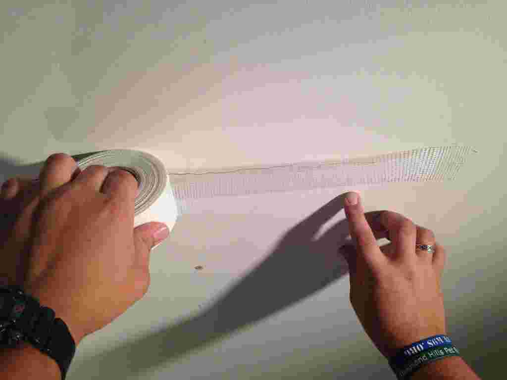 Этап требует сосредоточенности и физической силы. Наведенным раствором из цемента плотно наполняйте трещину. Как только смесь полностью схватится, возьмите полосу серпянки. Отдельные лоскуты этого материала применять нельзя, полотно должно быть целым. Ваша задача – ровно приклеить серпянку к потолку, совместив середину отреза с серединой руста.