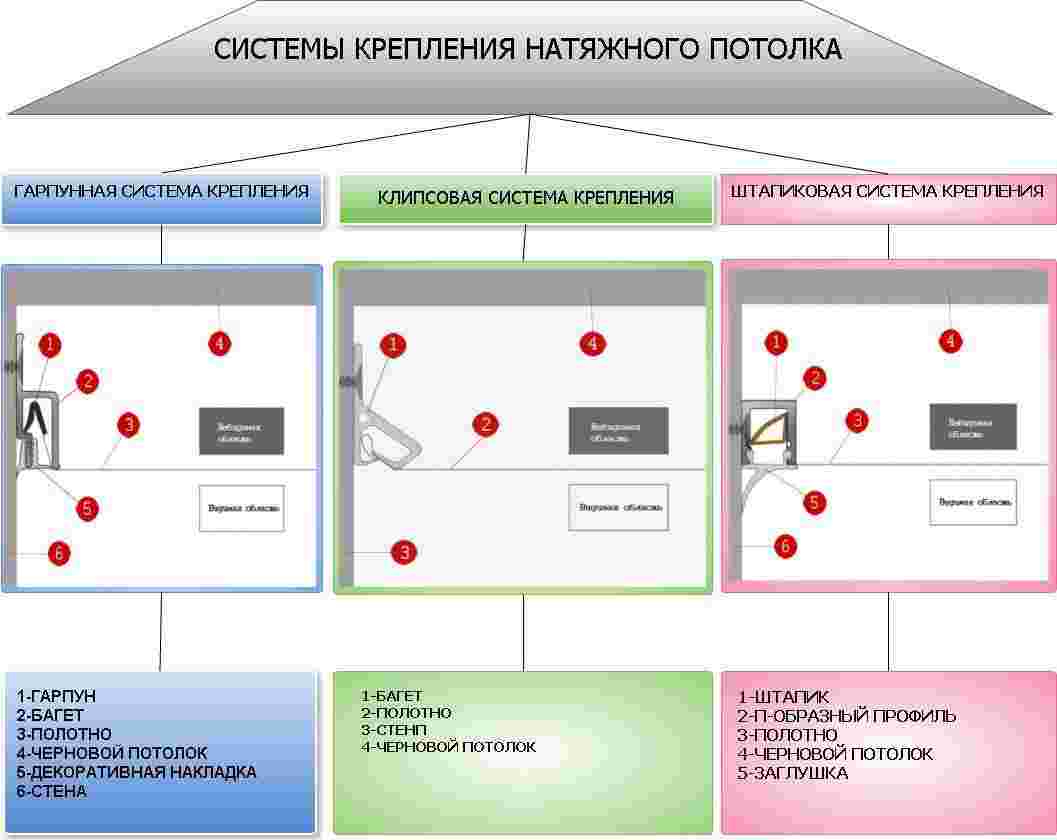 Конструкция потолков довольно проста: по периметру комнаты на желаемой высоте монтируют направляющие багеты, к ним крепят полотно и натягивают его. При этом монтаж ПВХ-полотен проводят с помощью тепловой пушки, а тканевых – холодным способом. Светильники и другие встроенные элементы устанавливают на специальной арматуре.