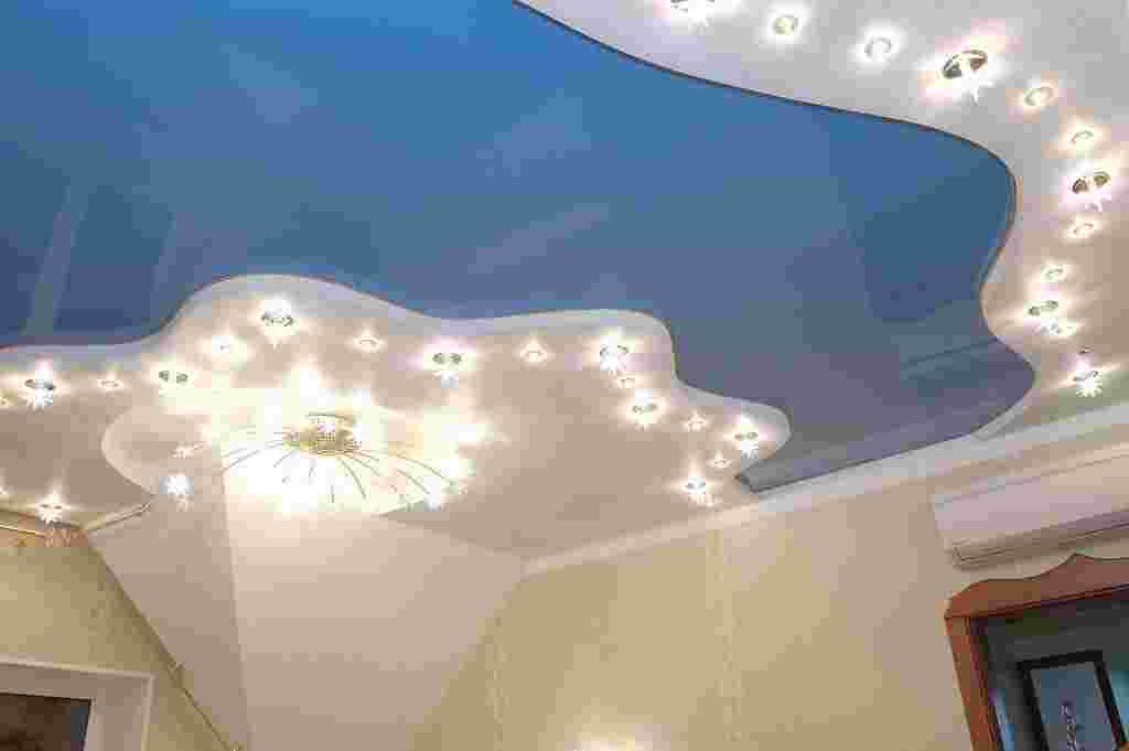 - Если вы стали задумываться о том, что неплохо бы сделать в потолке точечное освещение, то натяжные и подвесные потолки в этом случае подходят идеально. Ведь внутри подобной конструкции можно отлично спрятать все провода, да и сами светильники хорошо разместятся.