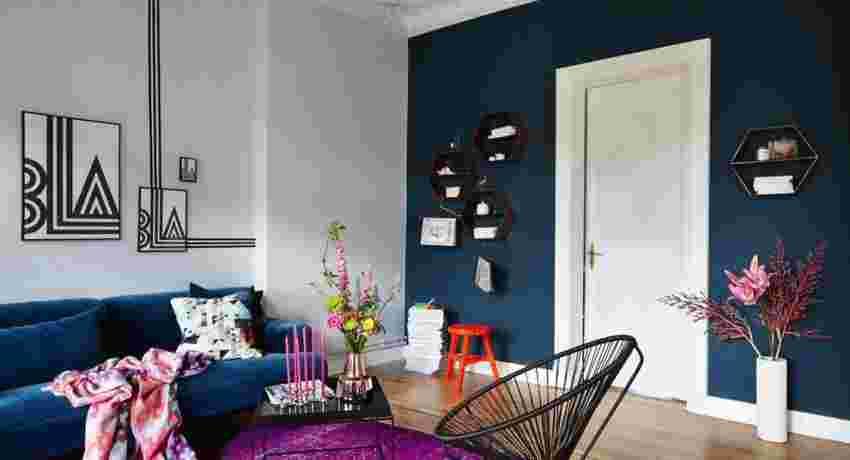 - Очень популярным является вариант окрашивания одной стены помещения в более насыщенные тона, а остальных – в спокойные и приглушенные.