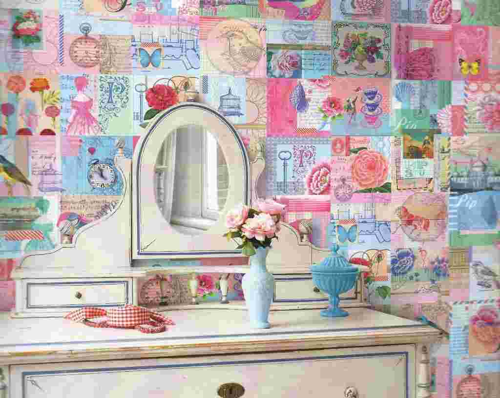 Сделать интересный дизайн комнаты можно используя части разных рулонов. От каждого вырезаются небольшие квадраты, с помощью которых можно оформить конкретную стену. Такой прием часто применяется в детских комнатах, делая акцент на учебную зону. Используют различные картинки животных и т.д. Такой способ часто называют — лоскутным.