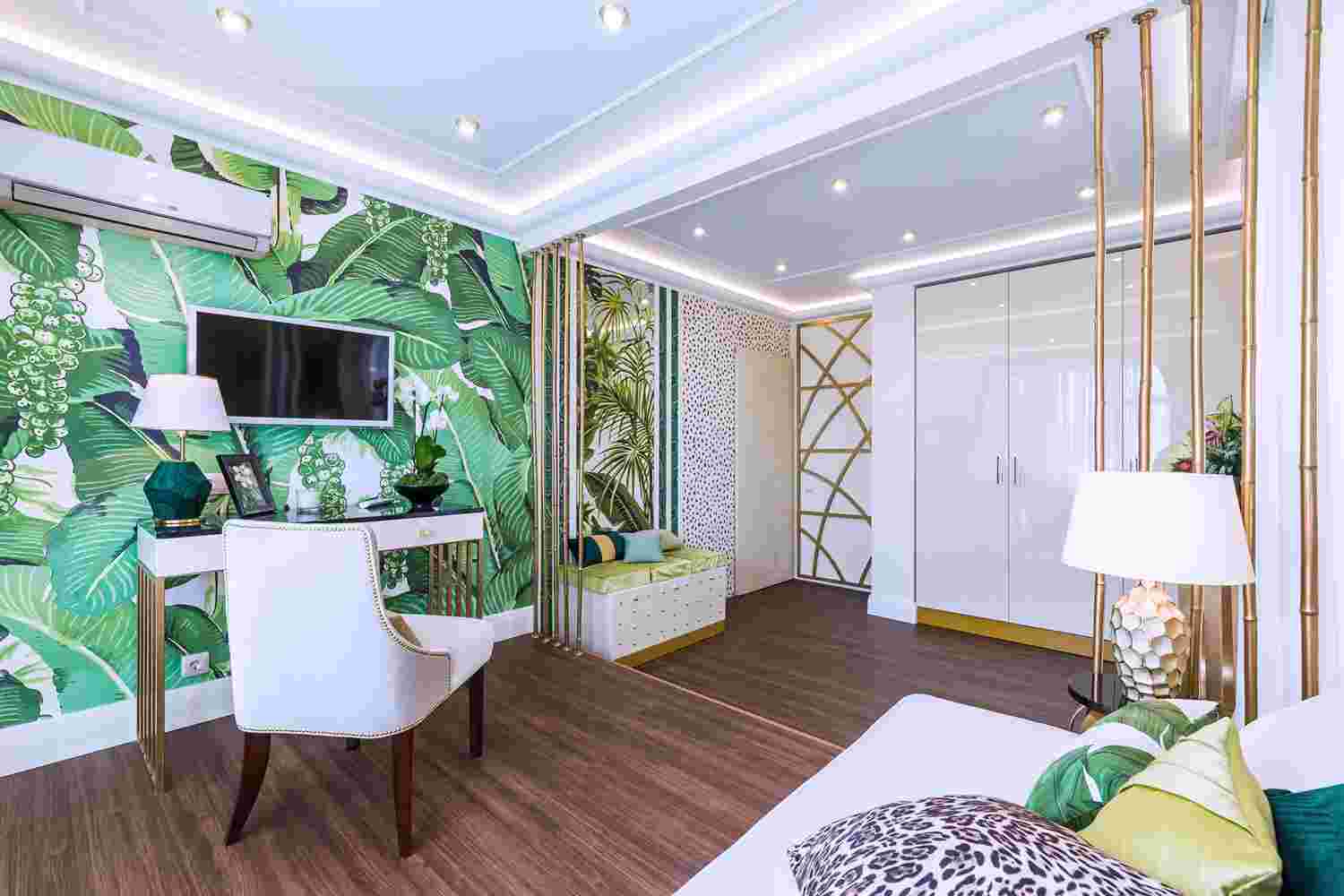 - Разными вариантами можно зонировать пространство, это делает комнату более комфортной и тёплой. К примеру, на кухне можно обеденную зону отделить визуально от рабочей. А в спальне часто спальное место с кроватью отделяют от остального пространства, это очень красиво и комфортно.