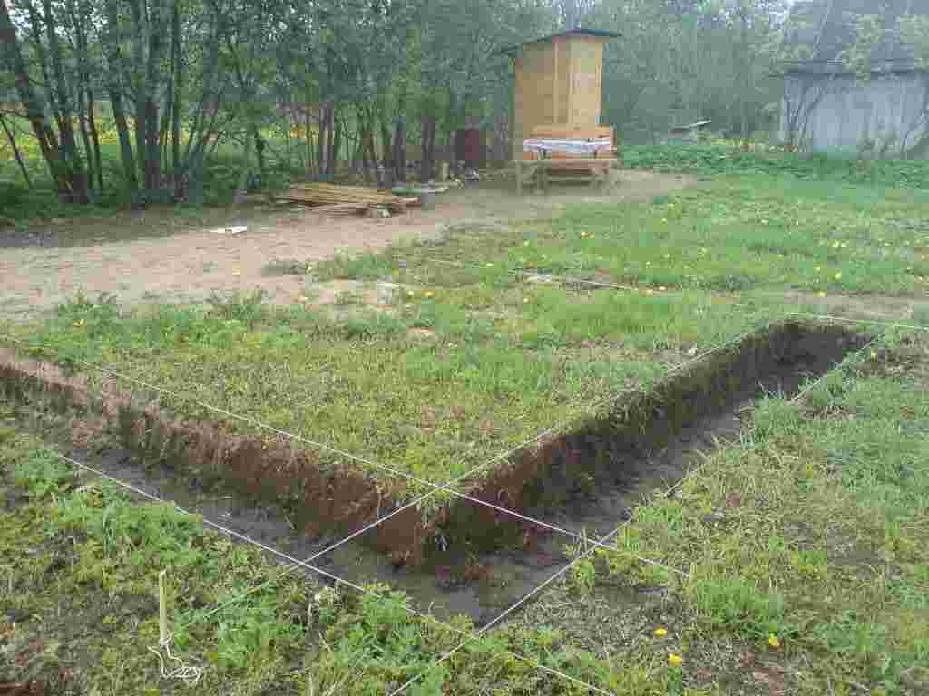 Роются траншеи, сверху которых будут стены, заполняются выбранным материалом, в зависимости от характеристик грунта: