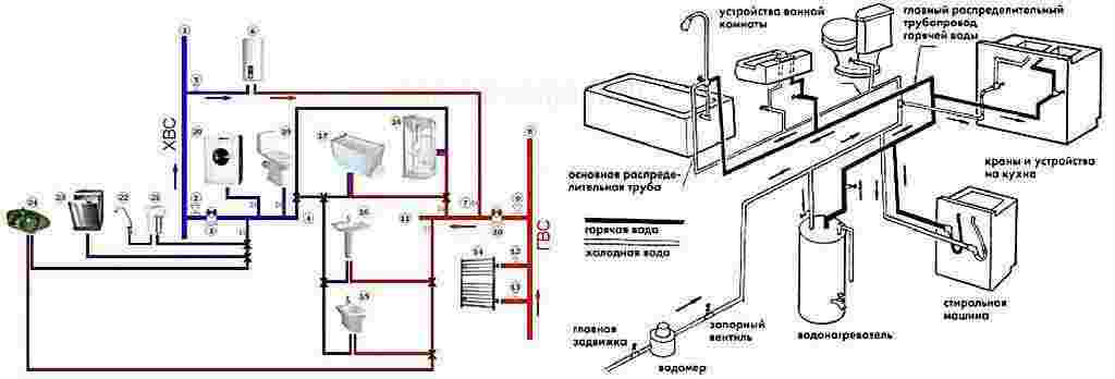 - Схема справа выполнена в изометрии – для красоты, что ли? Пересечения труб ее запутывают, а представления о реальном расположении точек разбора она не дает: стиралка с бойлером выходят под полом.