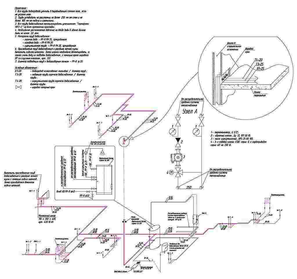 Последним этапом, после определения мест установки отопительных приборов, производится составление схемы разводки трубопроводов.