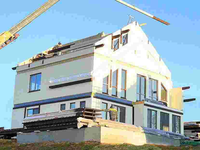 Это, скорее, частично-панельная технология, поскольку лишь 15% элементов дома изготавливаются промышленным способом. Остальные 85% — собираются на стройплощадке. Готовые элементы представляют собой деревянный или металлический каркас, одна сторона которого обшита ОСП-плитой со слоем изоляции. Строители монтируют каркас, закладывают утеплитель, а затем зашивают внешнюю сторону.