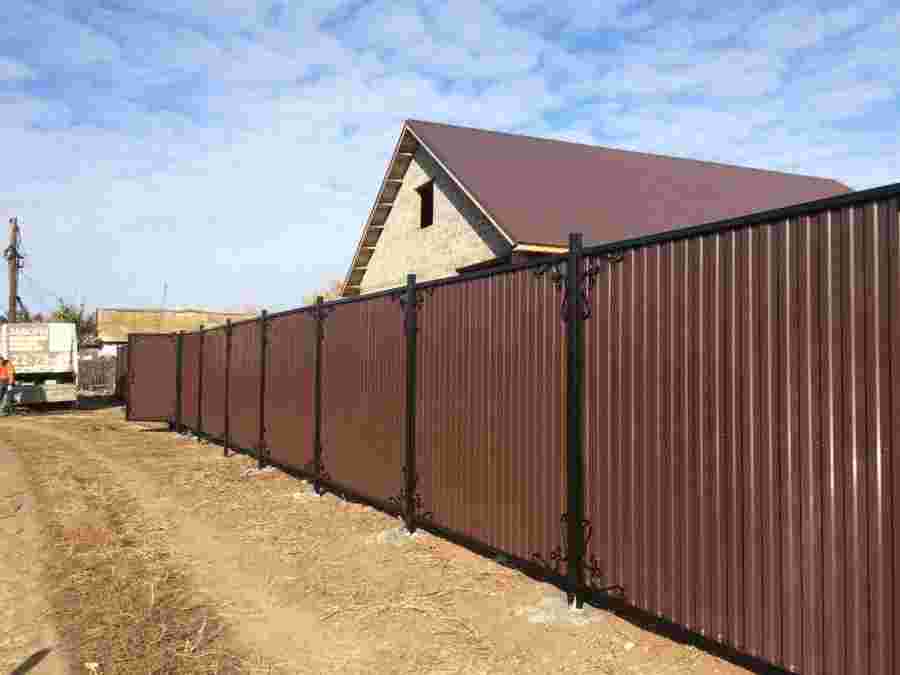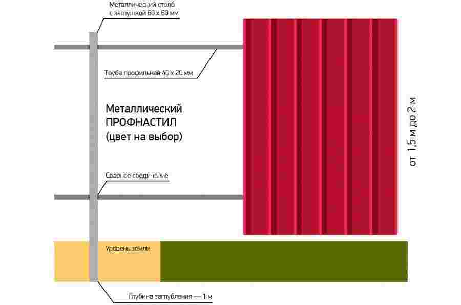 Держаться металлические листы будут на металлических или бетонных столбах. Ширина пролета должна быть 2,5-3м. Длину будущего забора делят на 3, чтобы рассчитать нужное количество столбов. Если планируется добавить ворота, добавляют еще 3 столбика. Высота опор рассчитывается с учетом того, что на 10-15см их нужно будет вкопать в землю.