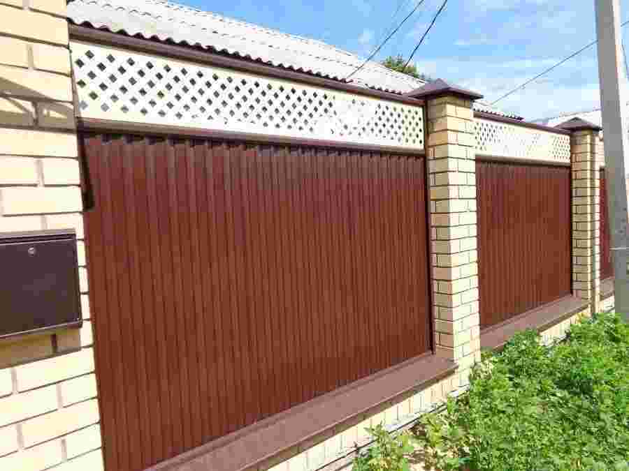 - возможность комбинировать профнастил с другими стройматериалами: кирпичом, камнем, поликарбонатом;