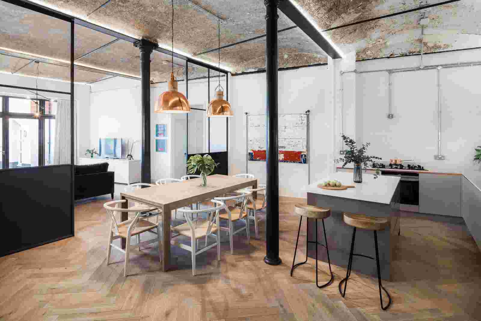 Не бойтесь смешивать разные материалы. Светлый бамбуковый паркет обратит еще больше внимания на большой деревянный обеденный стол. Металлические светильники придадут очарования интерьеру в любом стиле.