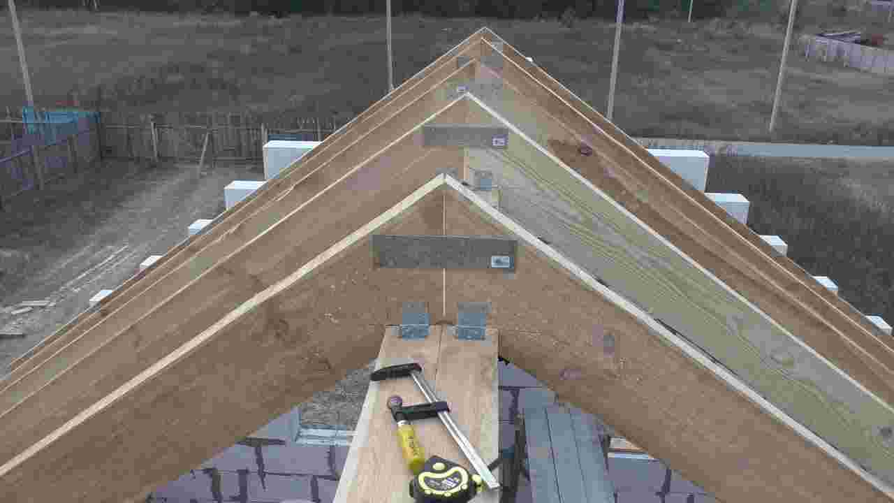 По основному шаблону собирают нужное количество стропильных ферм и поднимают их наверх, где устанавливают на определенном расстоянии друг от друга и надежно закрепляют. Крепление стропил в каркасном доме выполняется с помощью скоб или уголков. Между стропильными ногами прибивают по две доски, фиксирующие элементы между собой.
