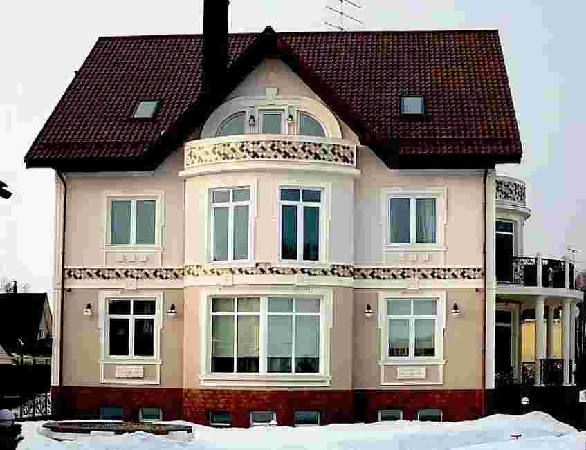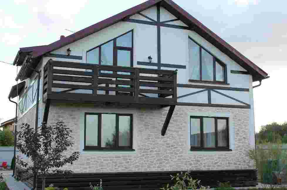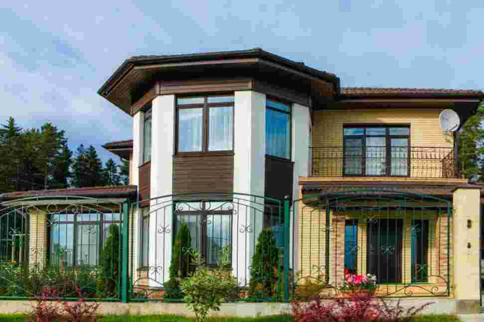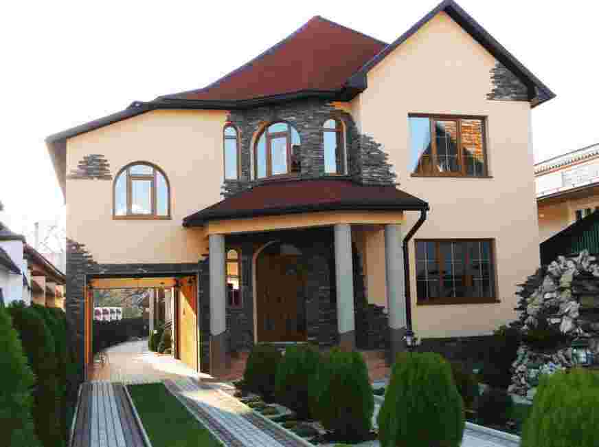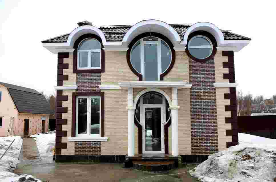 Важно не боятся экспериментировать с цветами, ведь использование контрастных решений позволит создать яркий и необычный фасад частного дома, демонстрирующий изысканный вкус хозяина жилья. Если боитесь ошибиться, то можно выбрать классический вариант, сочетая пастельные тона (коричневый и бежевый)
