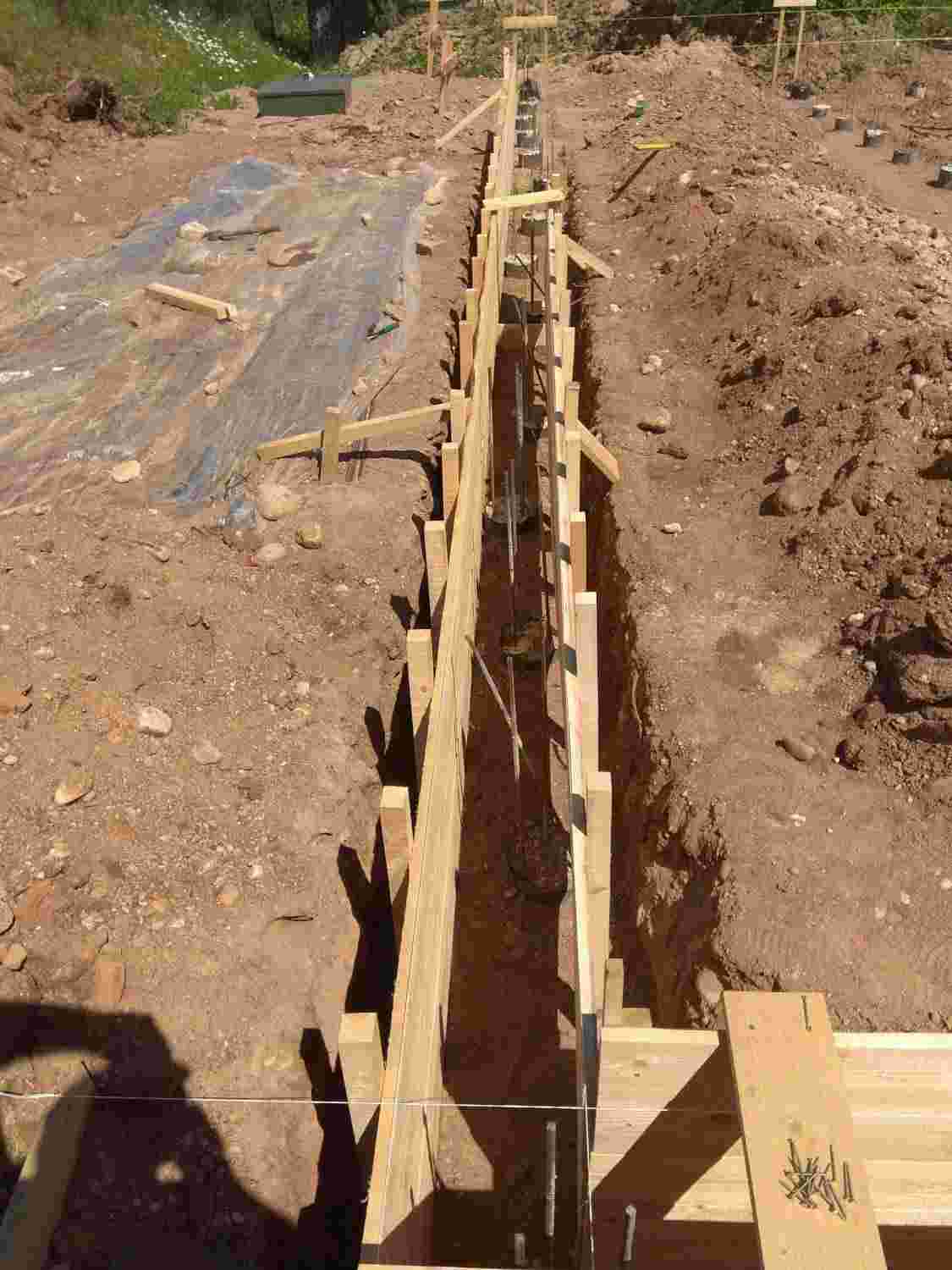 Ленточный фундамент устраивается из высококачественного бетона с обязательным армированием. Возводить данный тип основания лучше всего на почвах, не предрасположенных к пучинистости и заболачиванию. При необходимости на участках с небольшим уклоном проводят подсыпание грунта для выравнивания части склона, выделенной для фундамента.