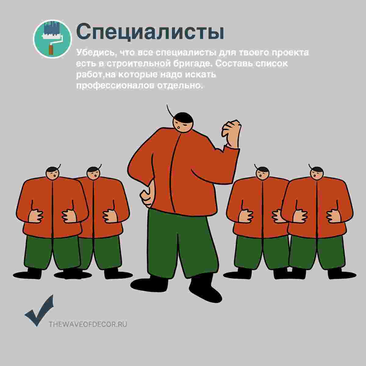 Если в твоем проекте надо выложить мозаику, старинный кирпич, камин восстановить, паркет отциклевать, то надо заранее понять, что бригада возьмет на себя, а каких спецов придется нанимать отдельно.