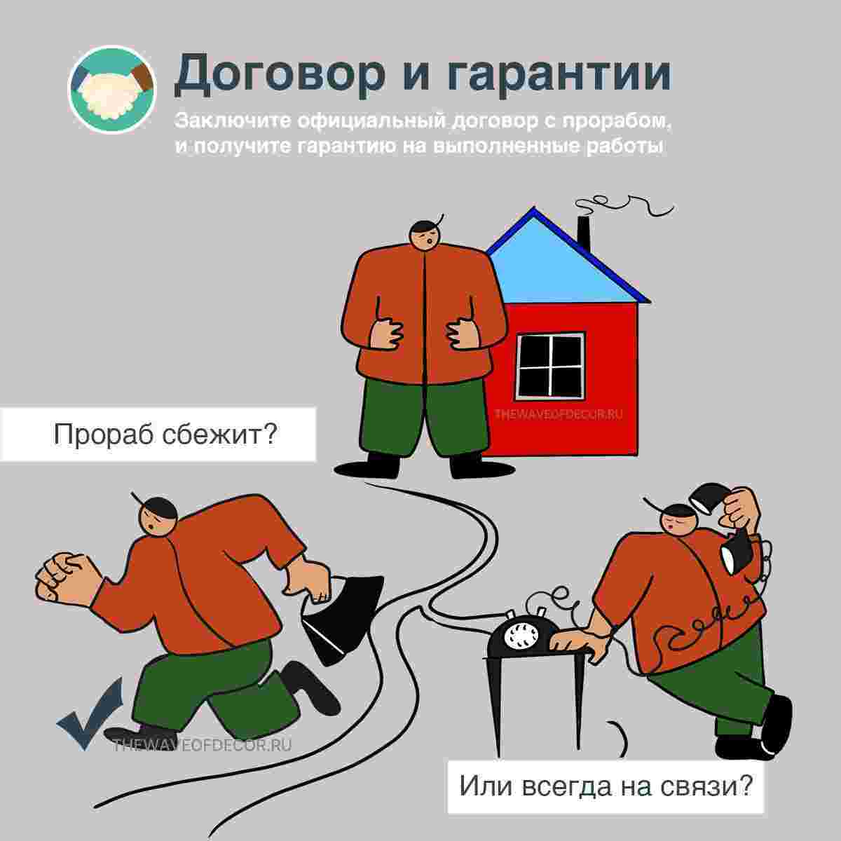 Вопрос гарантий на работы, прямо вытекает из договора. Прораб или дает или не дает их. Второй случай я бы не рассматривала сразу. Потому что если строители не дают гарантию на собственную работу – бежать от них надо без оглядки.