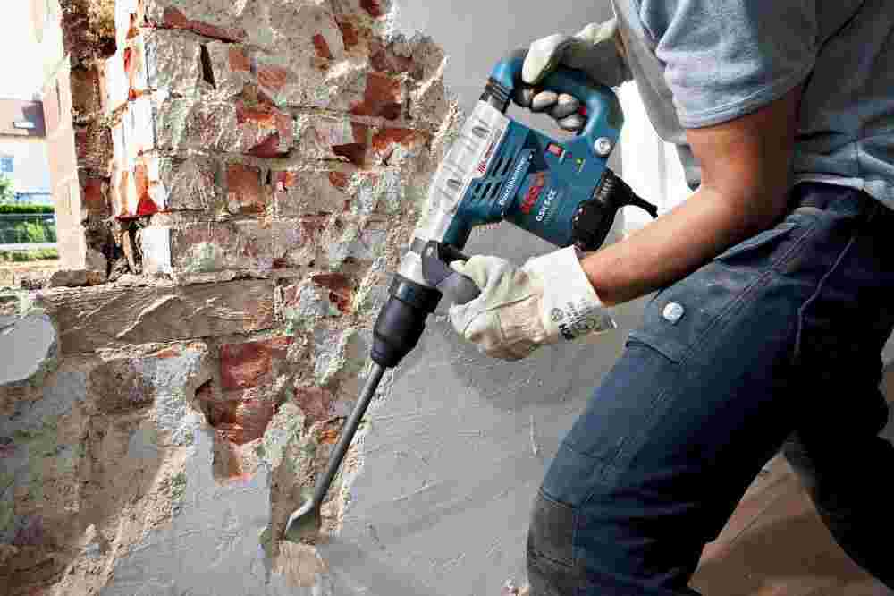 Отбивание старой штукатурки с помощью шпателя или молотка. Если она плохо отходит, применяют болгарку, перфоратор или специальную машинку с абразивными дисками. Перед этим стена должна быть смочена водой, чтобы было меньше пыли.