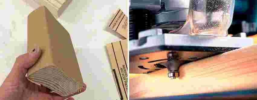 Прямоугольные рёбра смотрятся довольно грубо, поэтому их сглаживают фасками и спусками разного профиля. Самый простой способ разнообразить изделие — пройтись по внешнему и внутренним контурам наличника фигурной фрезой. Но возможны и варианты ручной обработки: