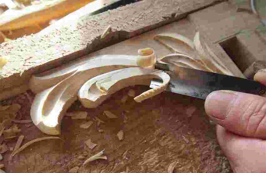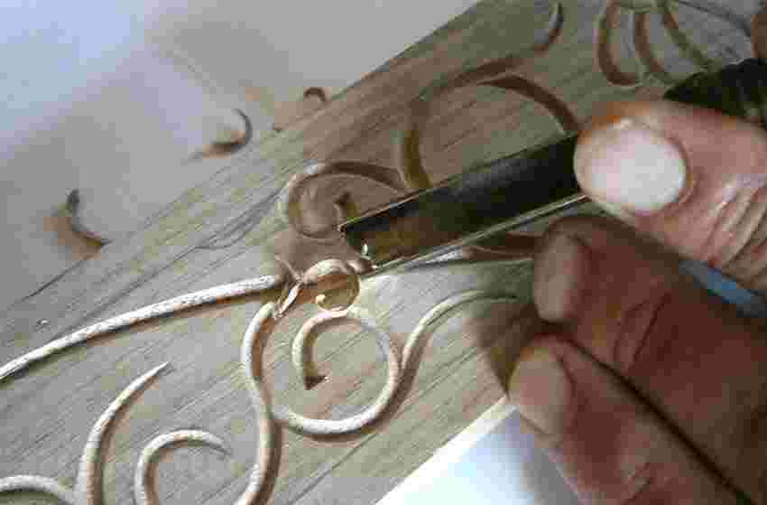 - Канавка (ветвь, борозда) изготавливается узкой стамеской или резцом с квадратной, треугольной или вогнутой формой лезвия. Резьба ведётся строго по линии, рельеф выбирается мелкой стружкой и затем шлифуется.