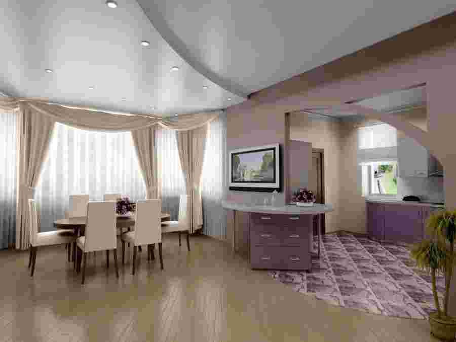 В комнате студии желательно при помощи потолка зонировать пространство. Если между обеденной частью и жилой сделать, например, перепад конструкции или применить разные материалы, то таким образом можно визуально разделить комнату на две части.