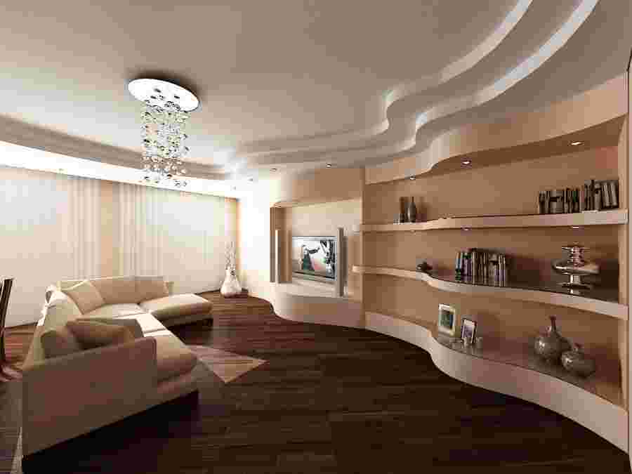 Волна может тянуться вдоль одной из стен в помещении или представлять собой двухстороннюю конструкцию, следующую вдоль двух перекрытий. Дизайнеры рекомендуют обращаться к таким прекрасным деталям в оформлении зала, обставленного яркой и оригинальной мебелью.