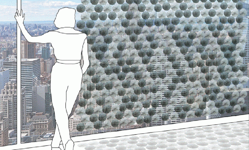 Технологически светоблокирующий фасад – это массив, состоящий из круглых деталей, напоминающих цветы. Каждая деталь (составляющая) содержит тканевый диск, через который проходят титан-никелевые провода, обладающие памятью формы. То есть, во время падения температуры воздуха материал сворачивается, приобретая прозрачность, однако при повышении температуры он приобретает свою первоначальную форму. Практически это выглядит так: при прохождении лучей солнца стекла затемняются, а после того когда солнце спрячется за горизонт или в пасмурную погоду стекла становятся прозрачными.