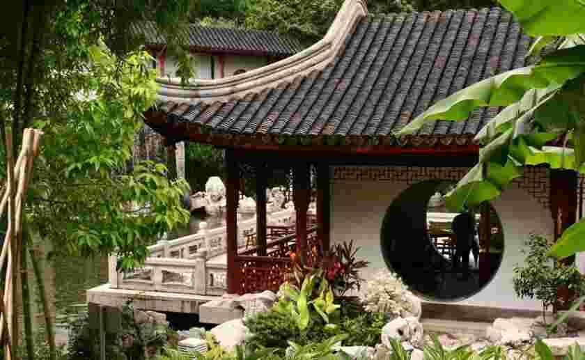 Поскольку в китайском саду всё подчиняется теории равновесия фэн-шуй, обустройство ландшафта здесь следует проводить в соответствии с её идеями: