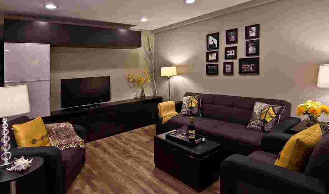 Тон стен, который не должен совпадать с цветом пола. Это будет смотреться нелепо и даже немного глупо. Оптимальным вариантом будет сделать пол на тон ярче или бледнее цвета стен. Так же, как и в случае с мебелью, если дизайн оформлен в гостиной с темными стенами, пол должен быть светлый, и наоборот. Но при этом тон пола может относиться к цветовой гамме стен. Например, коричневые стены хорошо сочетаются с бежевыми или желтыми оттенками, или синие обои – с голубым покрытием. Отличным считается дизайн гостиной, в которой серые стены и темный паркет.