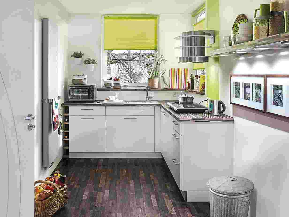 Если вы не относите себя к любителям исключительно светлых тонов, поэкспериментируйте с цветом пола. Например, темный цвет ламината (кафеля или паркета) сделает пространство «глубоким» и интересным, а яркие акценты в виде фартука в рабочей зоне или декора на полках и подоконнике существенно разнообразят светлый интерьер.