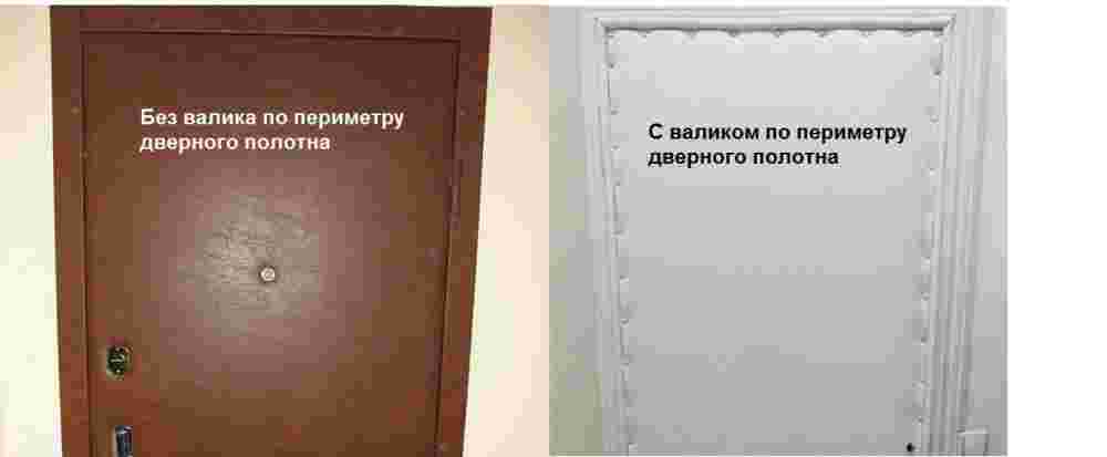 Для чего нужен этот валик? Для того, чтобы перекрывать возможные щели между полотном и косяком. Таким образом избегаем появления сквозняков и уменьшаем теплопотери. Но сделать валик можно только если обиваются двери со стороны открывания (двери открываются внутрь квартиры, вот изнутри их и обиваем). Если С другой стороны этот фокус не пройдет — не закроется. Тогда приходится обходится без валика.