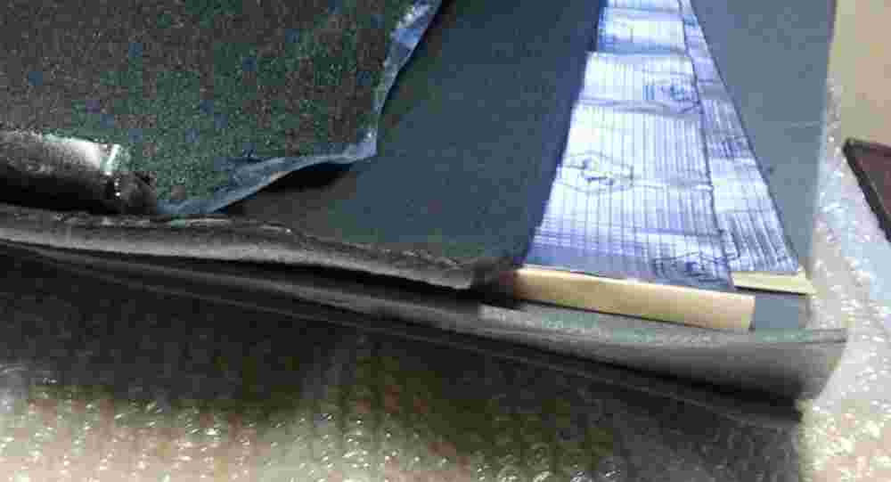 Следующий шаг — крепи звукоизоляцию. Она на клеевой основе, так что проблем нет — вырезали по размерам, аккуратно снимая пленку приклеили. Приклеивая стараемся выдавливать весь воздух, для этого пленку отдираем постепенно, проглаживая материал от края до края.